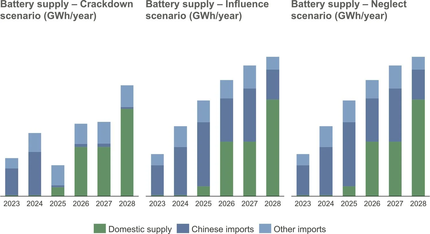 Under the first, UFLPA may be used to restrict China-made battery imports, supply plummets in 2025 as detentions surge, and imports from other countries (primarily South Korea) cannot make up the gap. The timeline is too short for US manufacturing to scale up quickly to meet the increased gap, and demand destruction is possible.