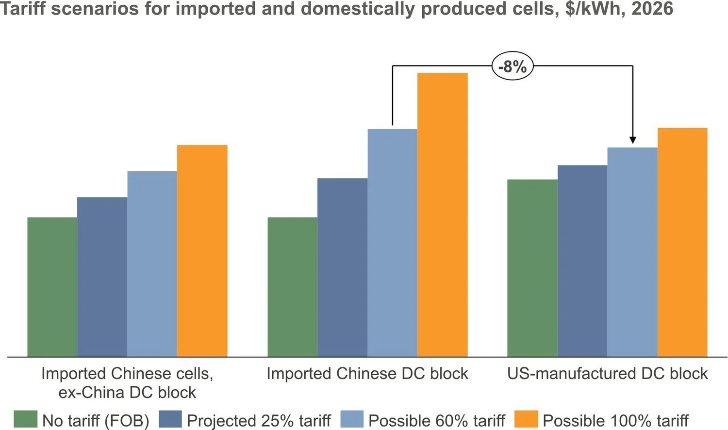 Notably, under a 60% to 100% high-tariff scenario, US-manufactured DC blocks would be cheaper than imported China-made DC blocks, even given recently plummeting prices coming out of China. This, plus tax credits, would allow domestically produced cells to dramatically out-compete imported battery storage systems. This does not, however, account for potential escalation.
