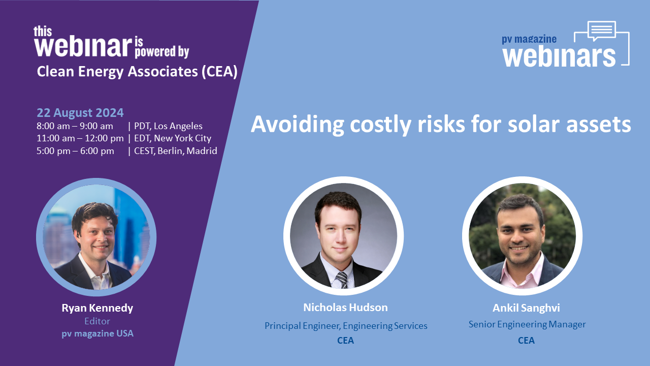 In this pv magazine Webinar, Nicholas Hudson, Principal Engineer Engineering Services, and Ankil Sanghvi, Senior Engineering Manager at CEA, will review various risks faced by solar assets, such as permitting and interconnection rejections, actions that may void a warranty, extended production outages, and thermal events.