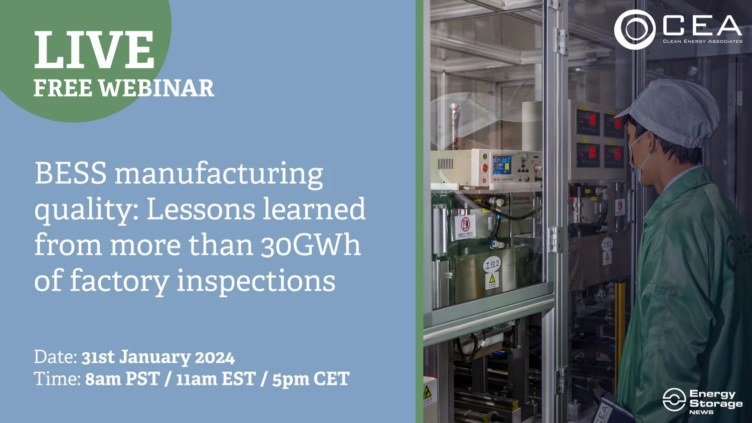 In this Energy-Storage.news webinar, CEA's BESS experts will share essential lessons learned from factory inspections of more than 30+ GWh of BESS projects conducted over the past six years. CEA’s senior director technology & quality, George Touloupas, and Chi Zhang, senior engineer energy storage, will explore what needs to be considered regarding BESS manufacturing quality assurance, from the component to the system level, what can go wrong, and why. This discussion will be enriched with case studies and an abundance of insights.