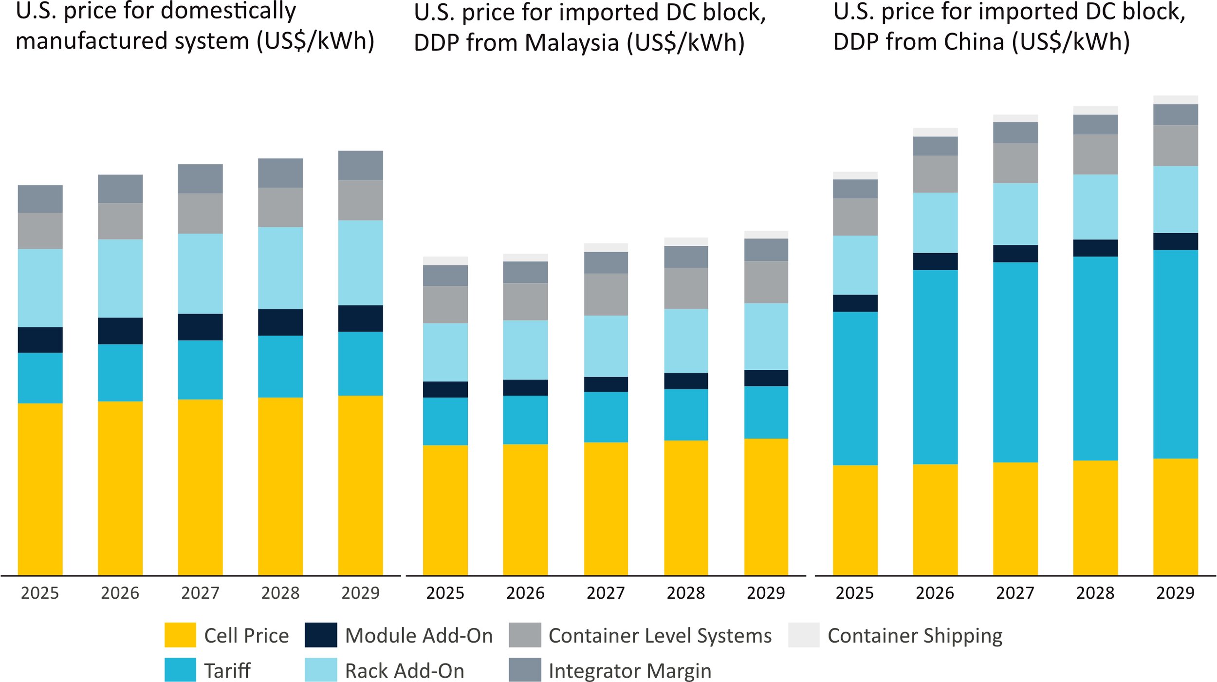 U.S. price for domestically manufactured system (US$/kWh), for imported DC block, DDP from Malaysia (US$/kWh), and for imported DC block, DDP from China (US$/kWh)