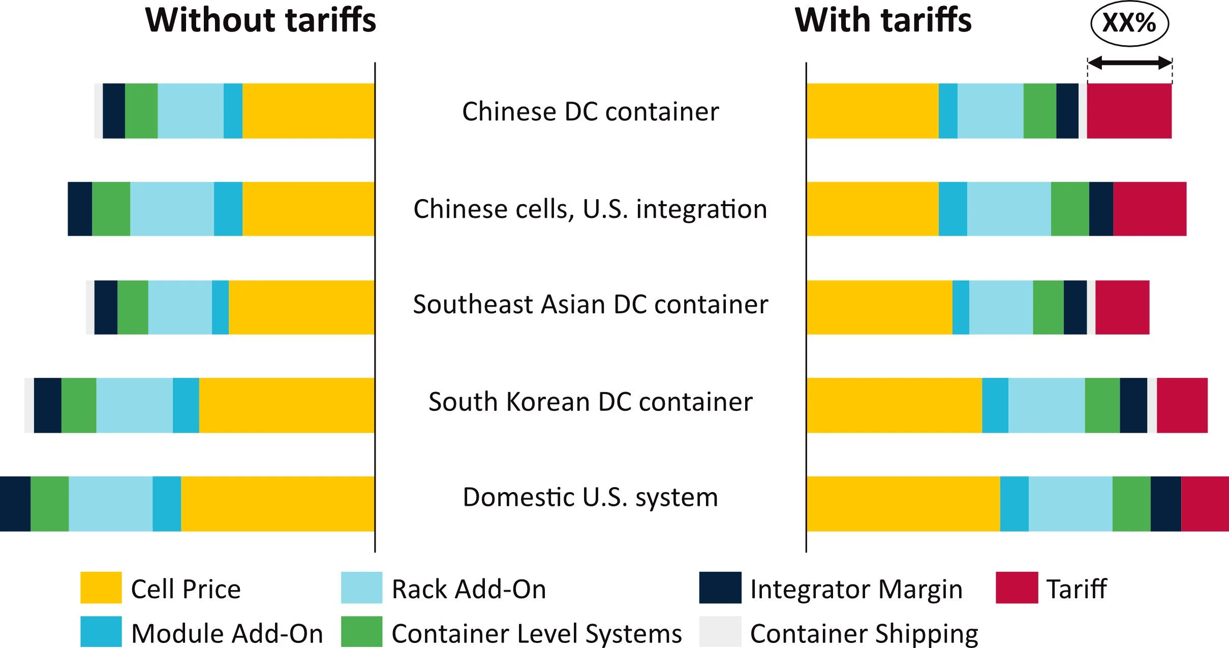 U.S. DC container scopes of supply with and without tariff impact, 2025 ($/kWh)