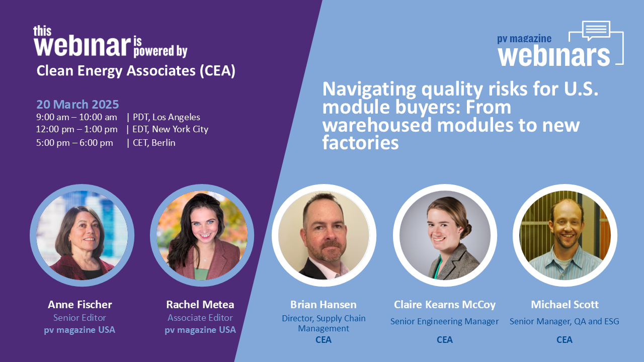 This pv magazine webinar addresses the quality risks U.S. solar module buyers face due to increased warehousing and the emergence of new manufacturing facilities. Experts from Clean Energy Associates (CEA) will discuss the rise in warehoused modules, common storage-related risks, quality concerns in new manufacturing environments, and strategies to mitigate these issues