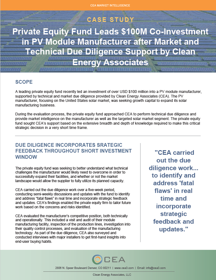 A leading private equity fund recently led an investment of over USD $100 million into a PV module manufacturer, supported by technical and market due diligence provided by Clean Energy Associates (CEA). The PV manufacturer, focusing on the United States solar market, was seeking growth capital to expand its solar manufacturing business.