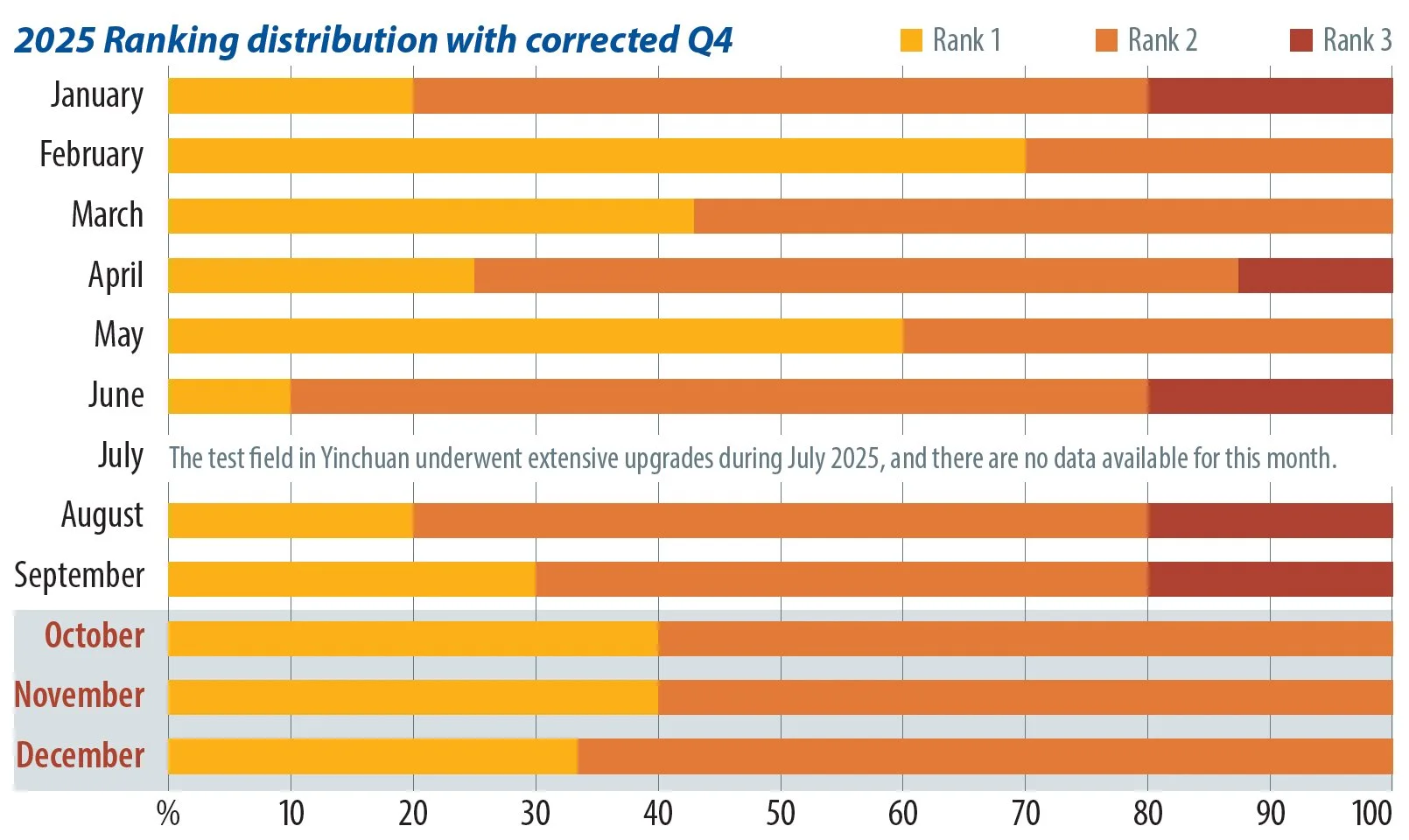 Recalculating the Q4 2025 performance rankings with updated power ratings shifted all 10 samples back into Rank 1 or Rank 2, with a notable increase in Rank 1 placements. This suggests that previous underperformance was primarily due to power degradation. It is likely that this degradation began earlier in the year, also contributing to the Rank 3 results observed in the third quarter.