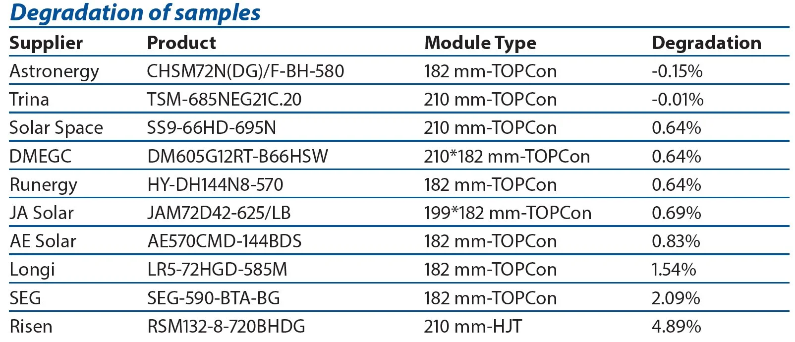 Longi (TOPCon), produced before December 2023: Despite a higher- than-average degradation of 1.54%, the Longi sample consistently maintained a mid-level Rank 2 position despite belonging to an earlier generation of TOPCon technology. Further testing revealed that its superior low-irradiance response and favorable temperature coefficient effectively compensated for the power degradation.