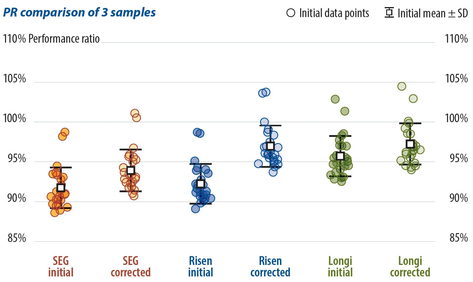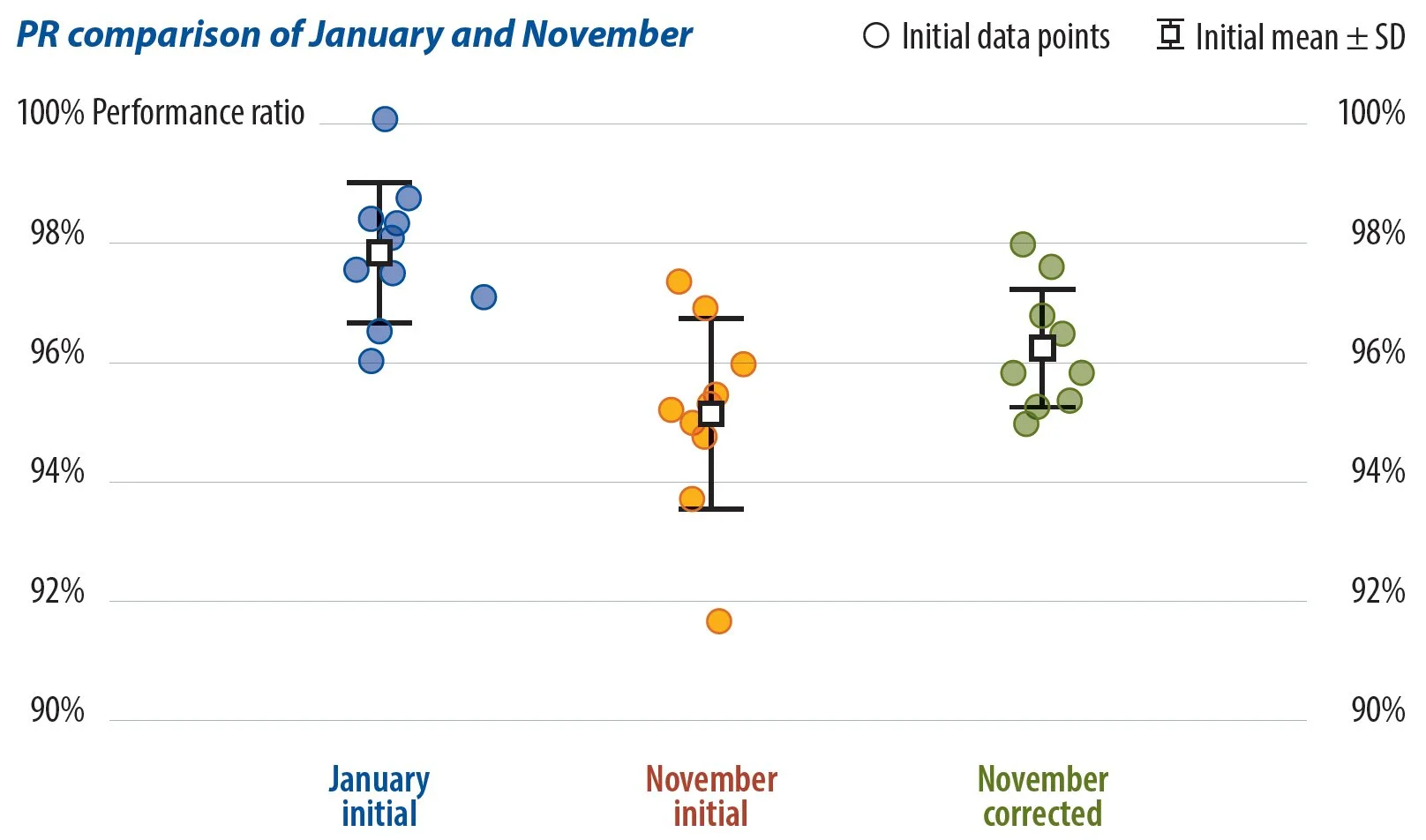 As shown in the chart, the January PR values of the newly installed modules were high and relatively concentrated. After 10 months in operation, the November PR (based on initially measured module power) widened, with the standard deviation increasing from 1.1% in January to 1.5% in November. When the November PR data were corrected using the newly tested maximum power ratings, the standard deviation dropped back to 0.9% – a result close to the original value.