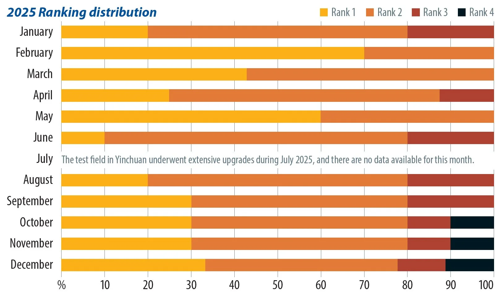 For most of 2025, nearly all samples consistently maintained Rank 1 or 2 status, achieving an energy yield within 1.5% of the top performing product in each rank. This suggests uniform performance across the samples during the first nine months. A performance gap began to emerge in the second half of the year. By the fourth quarter, a subset of the samples began to consistently underperform, falling permanently behind the rest of the group in rank position.