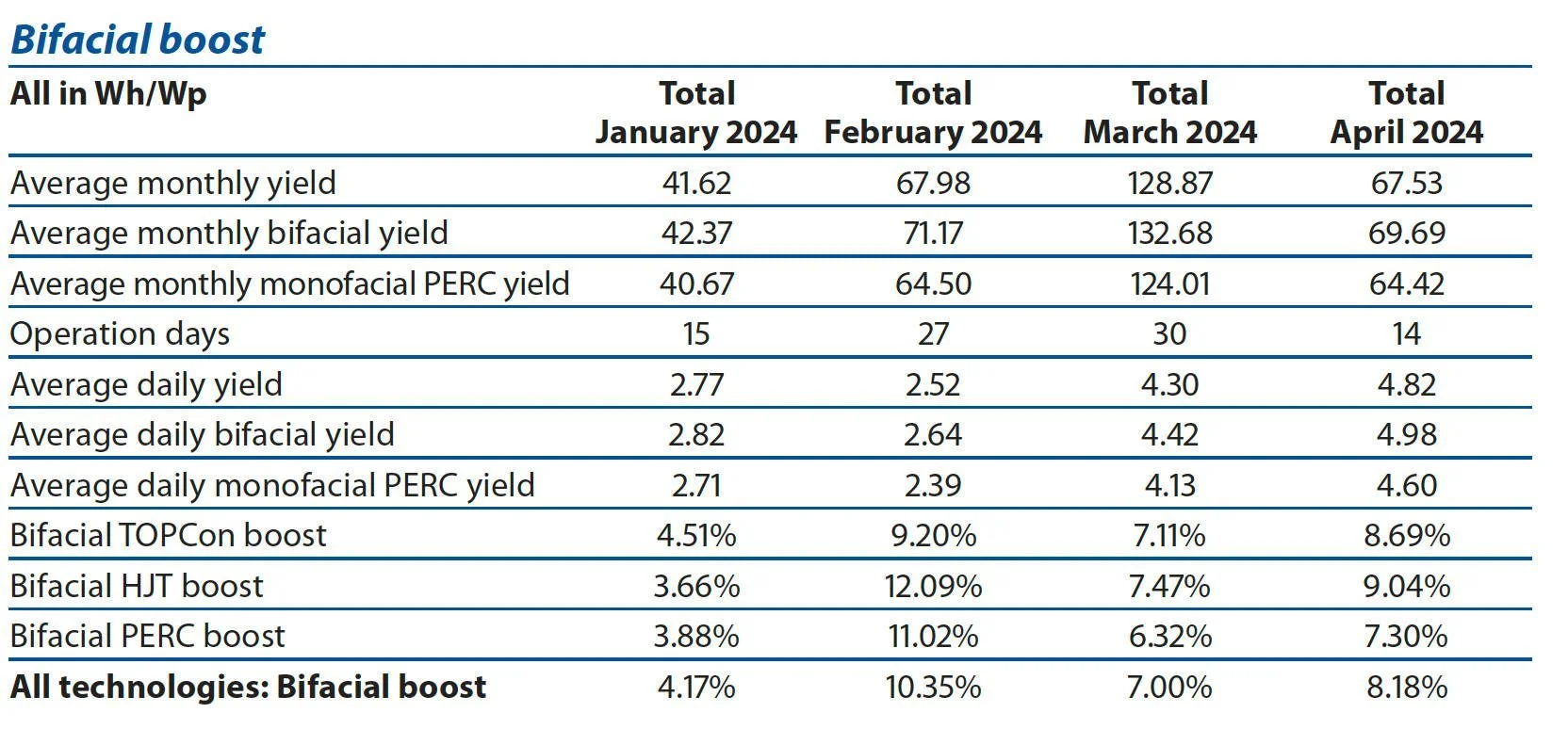 Table 1: Bifacial boost - January 2024 to April 2024