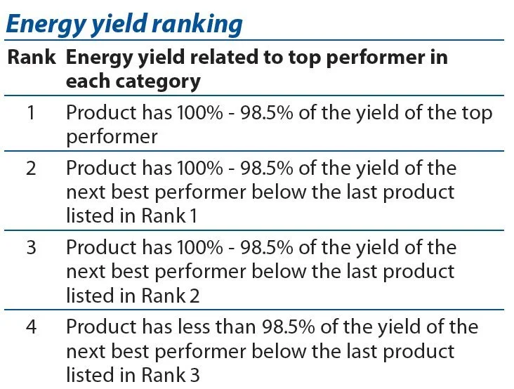 Energy yield related to top performer in each category.