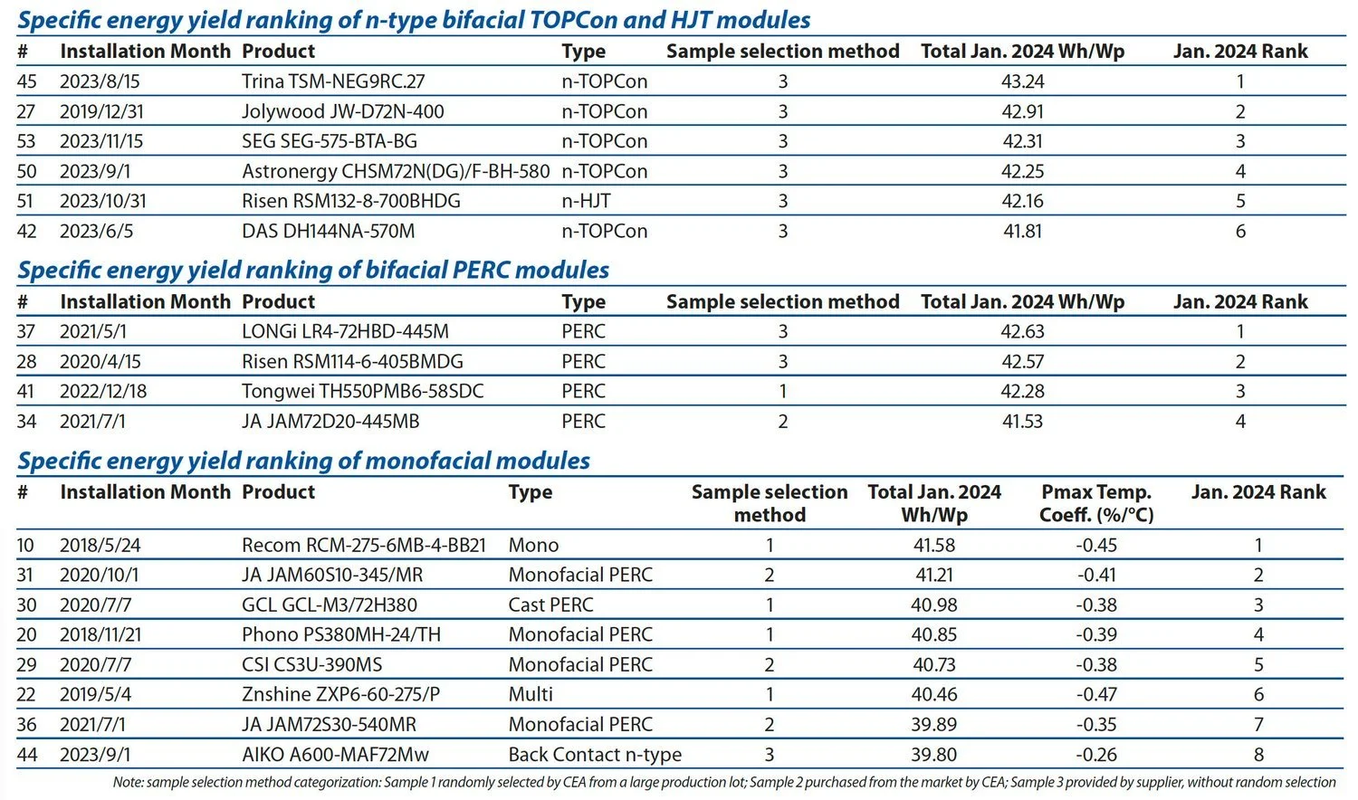 Table 3: Specific energy-yield ranking of bifacial PERC modules - January 2024