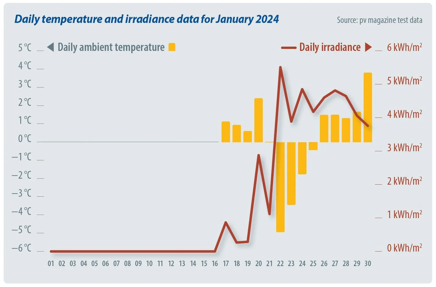 A total of five products had to be removed from this month’s results, as two presented irregular performance requiring investigation, and three temporarily lost connection with the data collection system. The first chart below shows the meteo station data (irradiance and ambient temperature) for the second half of January 2024.