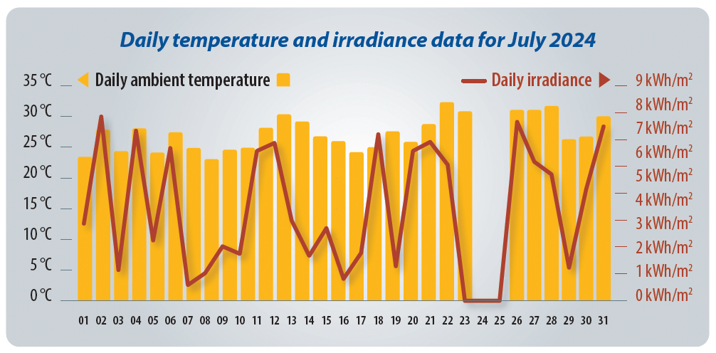 The recently installed product from SolarSpace has its first full month of data available. Due to work on the installation, the system was disconnected and three days of data are excluded. The first chart shows the meteo station data (irradiance and ambient temperature) for July 2024.