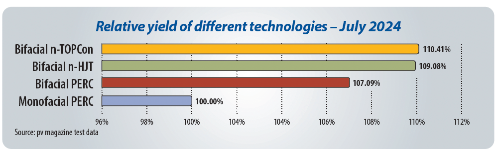 Figure 2: Specific energy yield of n-type bifacial (TOPCon and HJT), bifacial PERC, and monofacial modules - July 2024