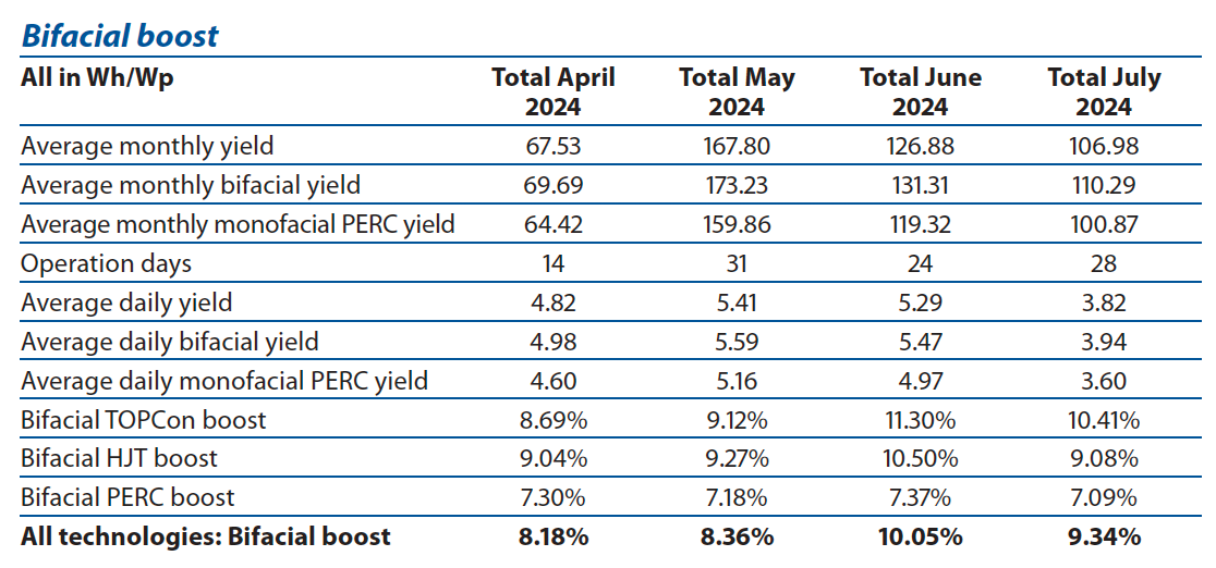 The average bifacial boost is 9.34% for July 2024. Bifacial boost is defined as the relative advantage of all bifacial products compared to the average specific energy yield of all monofacial PERC products. The newly installed TOPCon products that performed well in June remain at the top rank. The new SolarSpace product also performed well, reaching the second rank, which resulted in a higher bifacial boost for TOPCon than HJT, which is only represented by two products. As noted in the previous month’s article, more HJT products are needed to be studied over time to draw conclusions.