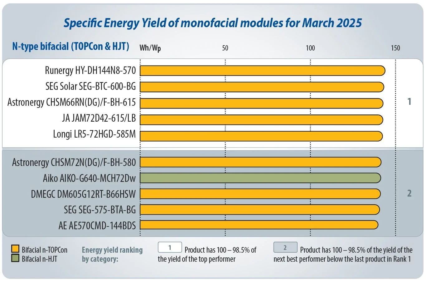 Figure 2: Specific energy yield of N-type bifacial (TOPCon & HJT) modules for March 2025