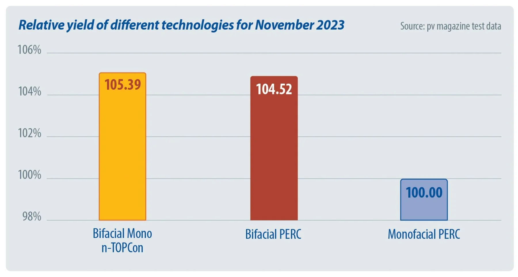 The average bifacial boost was 4.69% for November 2023. Bifacial boost is the relative advantage of the average specific energy yield of all bifacial products compared to the average specific energy yield of all monofacial PERC products.
