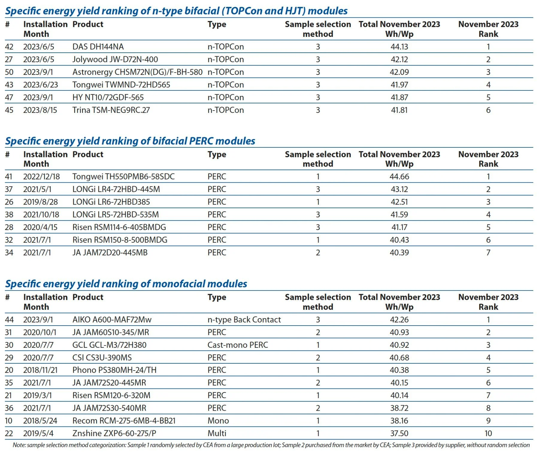 Table 3: Specific energy-yield ranking of bifacial PERC modules - November 2023