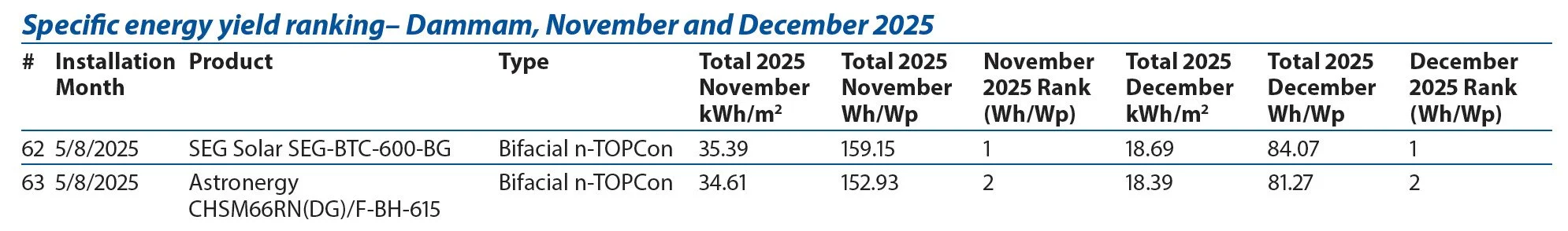 Table 2: Specific energy yield ranking from Dammam, November and December 2025