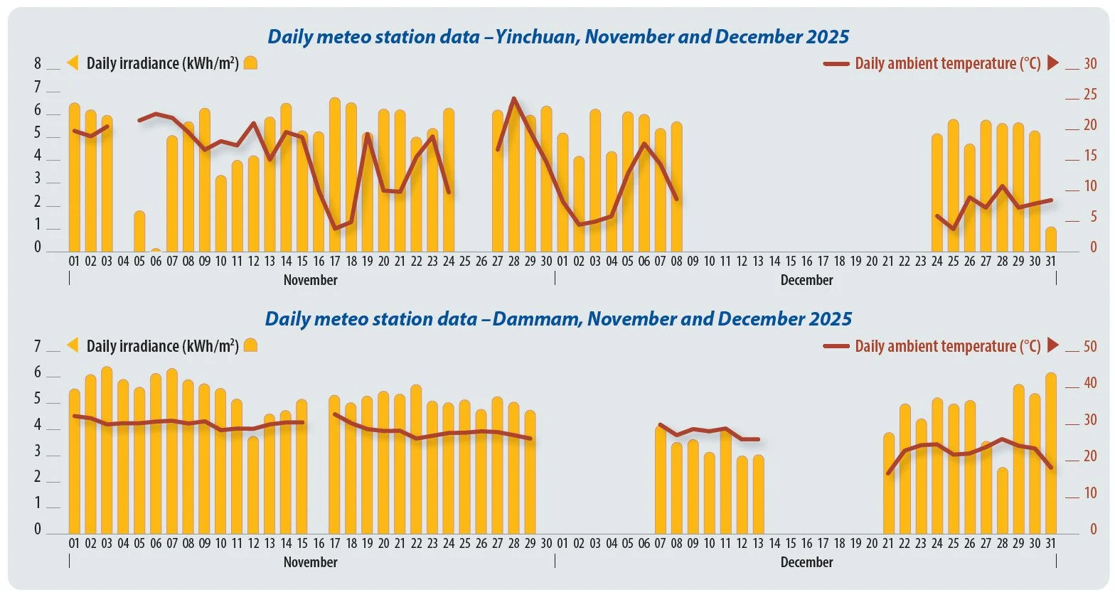 The test site in Dammam, Saudi Arabia, experienced various technical interruptions in November and December 2025. The field results for Nov. 16 and 30, as well as Dec. 1 to 6, 14 to 20, 16, and 30, have been excluded. These gaps were caused by regional power outages in Dammam, scheduled work in the test field, and significant communication issues throughout December. Consequently, both meteorological and production records for these dates were removed to ensure the overall integrity of the dataset. Irradiance and temperature were slightly lower in November and December, but the relative performance of the products remained unchanged.