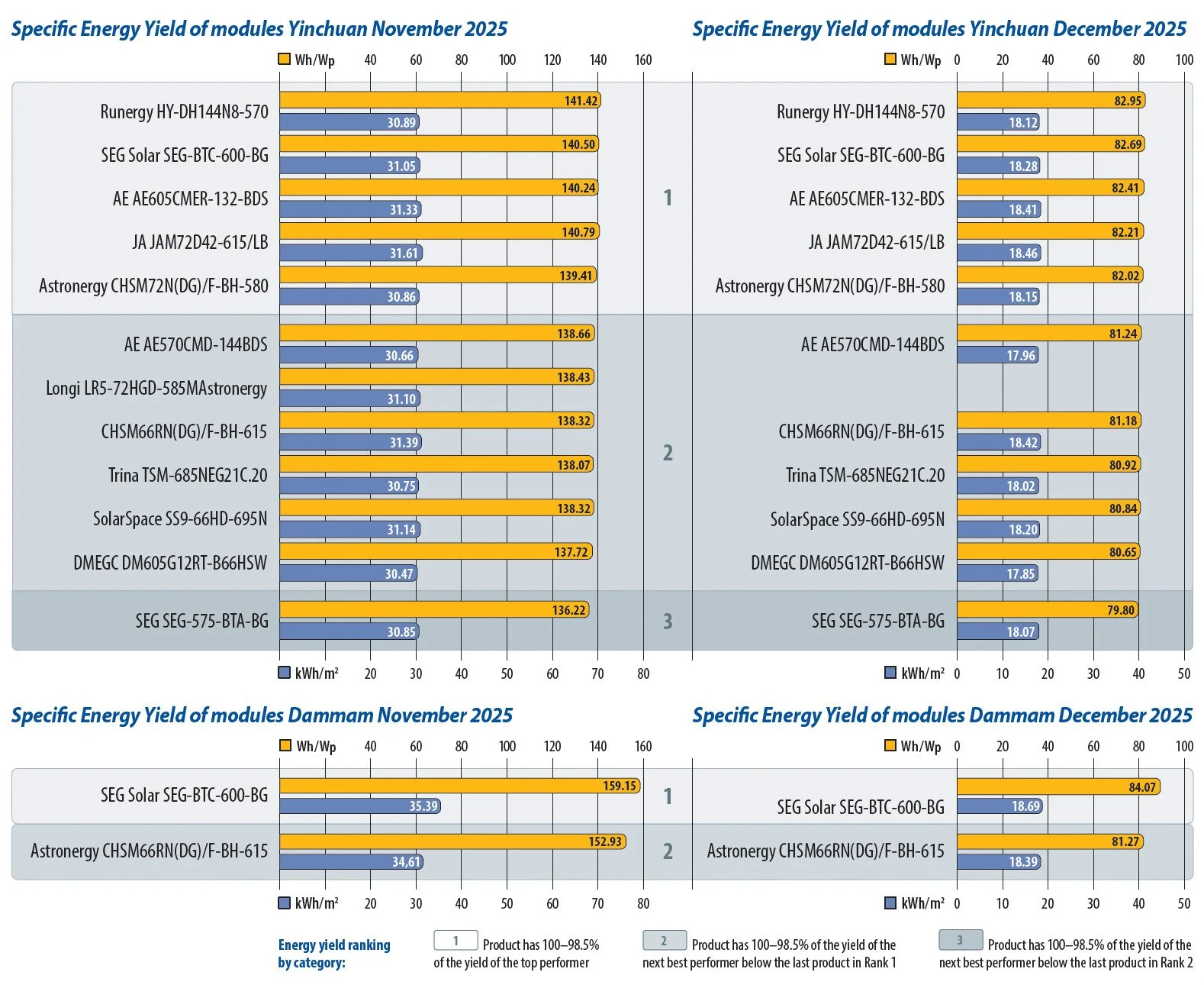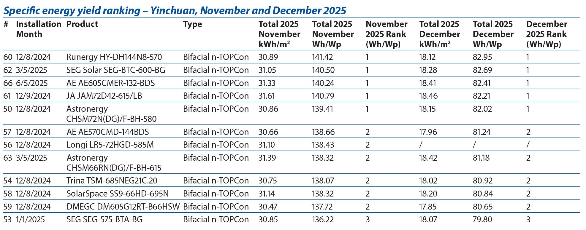 Table 1: Specific energy yield ranking from Yinchuan, November and December 2025