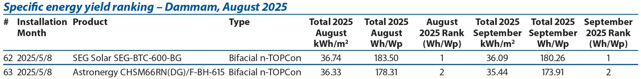 Table 2: Specific energy yield ranking from Dammam, August to September 2025