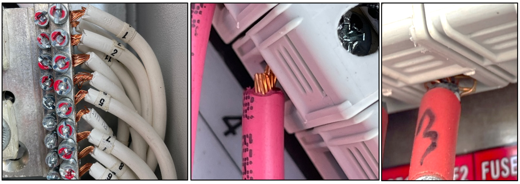 Figure 2: Three examples of improper terminations. Cut strands, scored wire strands from improper wire trimming, and improperly terminated wire terminations. All of these examples require remediation prior to re-energization.